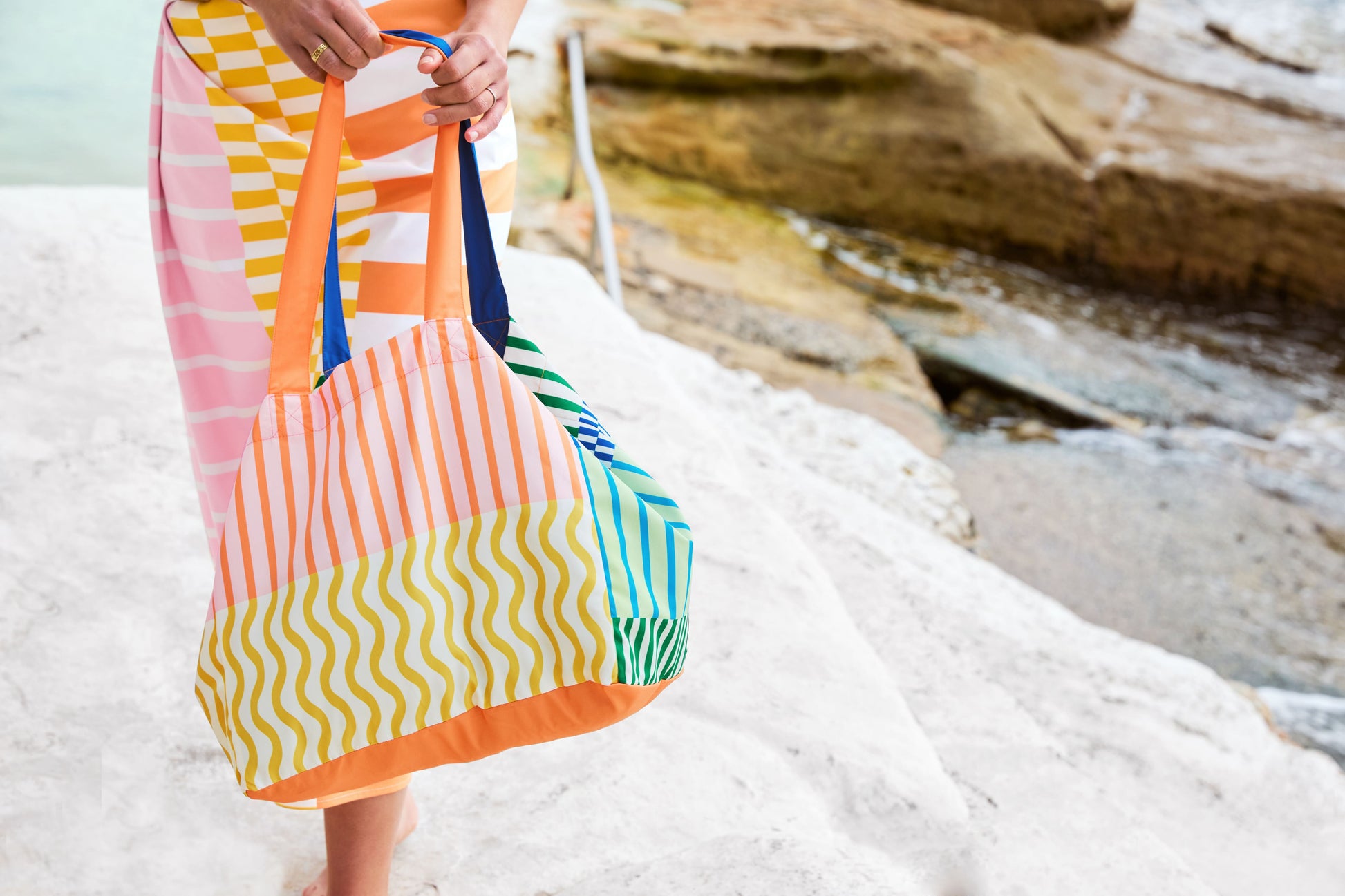 Fold-away, super strong, roomy and made from 100% recycled materials, this colourful fold-away tote is perfect for beach days or popping to the shops.