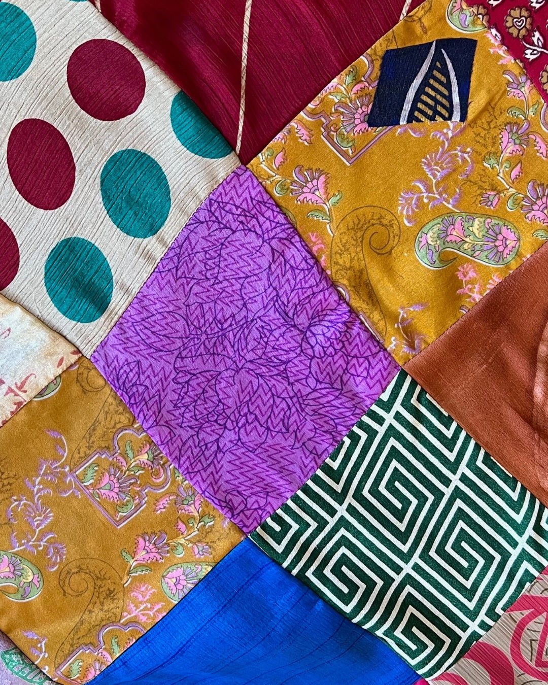 A vibrant patchwork cushion cover crafted from upcycled sari and brocade fabric.
