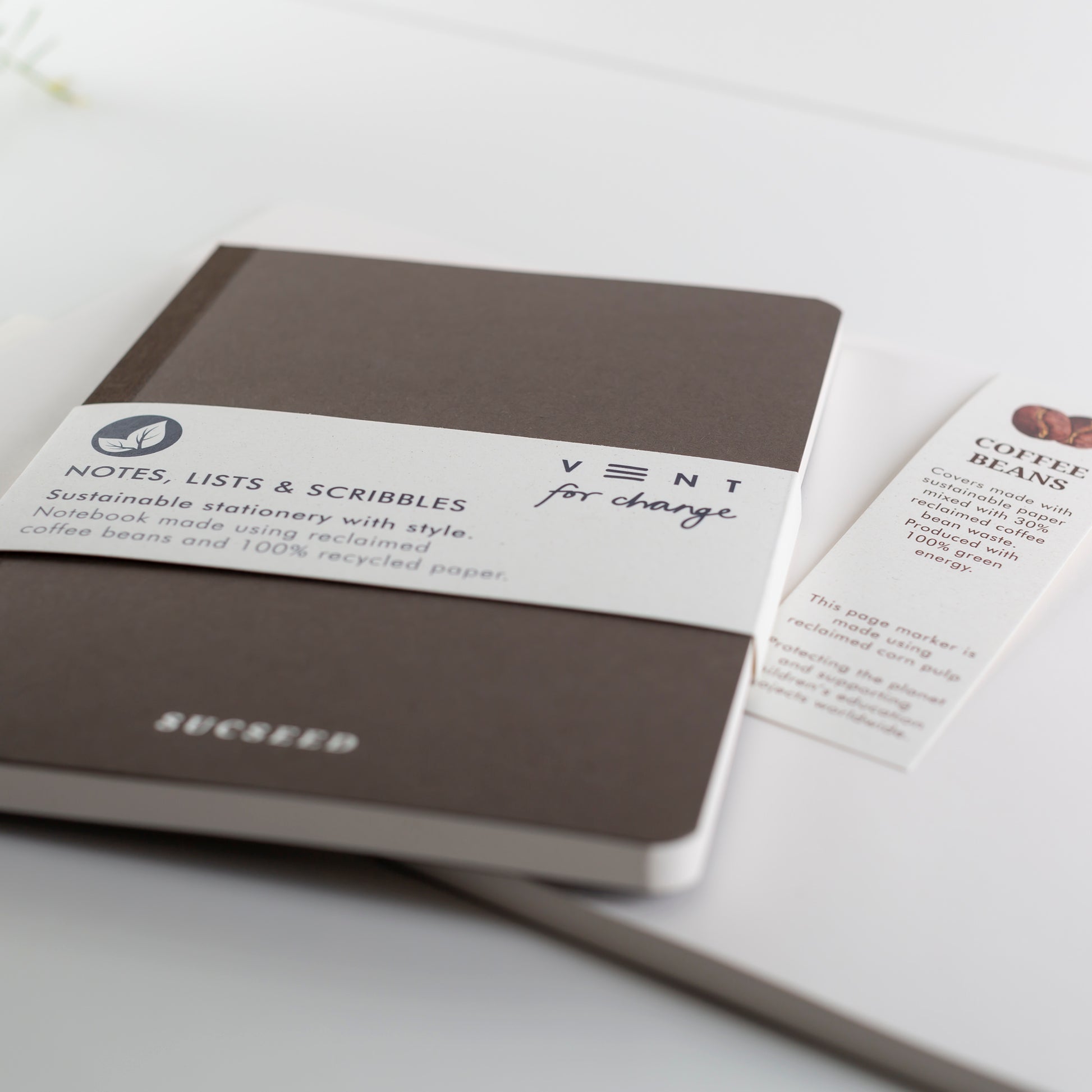 A stylish A6 notebook bound by covers made using reclaimed coffee beans mixed with recycled paper.